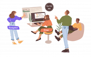 En pratique, c’est une équipe à compétences multiples qui se retrouve dans une même salle (également possible à distance) pour réfléchir au même problème en même temps. Il n’y a cependant qu’une seule personne qui écrit le code : le ‘driver’, son rôle est en quelque sorte le scribe, c’est la paire de mains qui fait le relai entre les idées qui sont partagées et l’ordinateur. Un autre rôle se distingue, celui du ‘navigateur’ qui donne la direction à suivre. Une rotation est faite sur des intervalles de temps assez courts (de l’ordre de 10 minutes). Ainsi, chaque personne de l’équipe sera à un moment le driver, le navigateur, ou un membre de l’équipe.