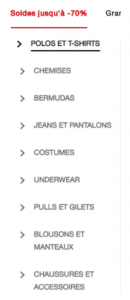 Afficher une entrée « Solde » dans le menu, c’est bien mais ajouter des sous-catégories aux soldes, c’est mieux ! N’hésitez pas à bien renseigner tout type de catégories pour lesquelles vous faites des opérations soldes. Avoir un menu déroulant par exemple peut s’avérer très utile dans la navigation de l’utilisateur. Ce qui pourrait ressembler à ceci :