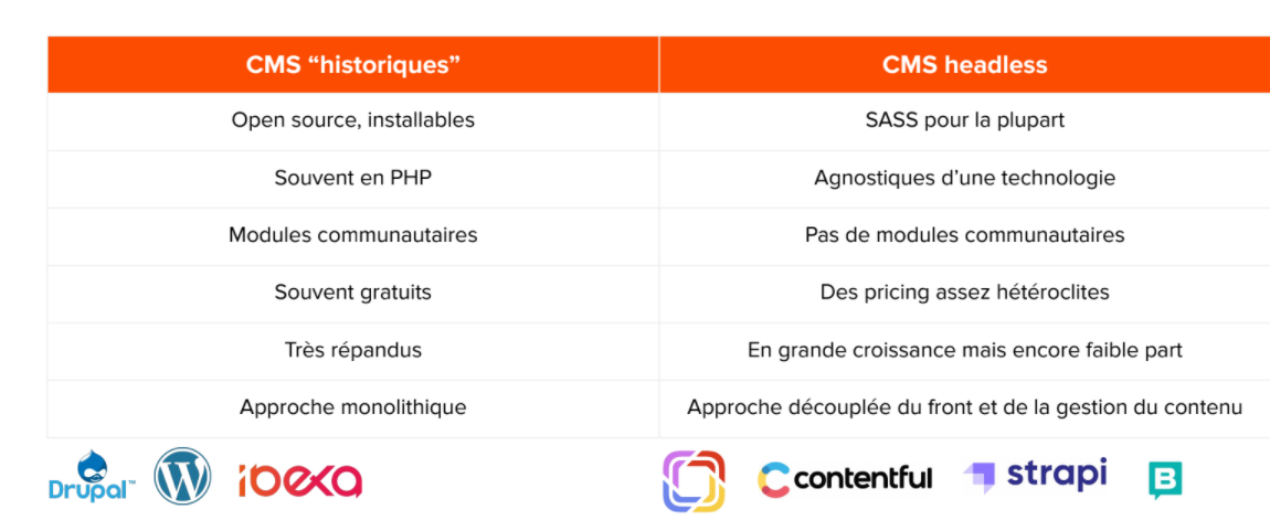 Les outils technologiques ont également beaucoup changé, notamment sur la partie CMS. Les CMS « historiques » tels que Drupal, WordPress ou encore eZ Publish (ibexa) présentent de nombreux avantages encore aujourd’hui : ils sont très répandus, souvent gratuits, et ont beaucoup de modules communautaires. Cependant, ils offrent une approche monolithique : votre contenu va alors être extrêmement lié à votre site. Il sera de ce fait très compliqué d’utiliser le contenu de votre site et de le déployer sur une application mobile ou encore une borne interactive par exemple.